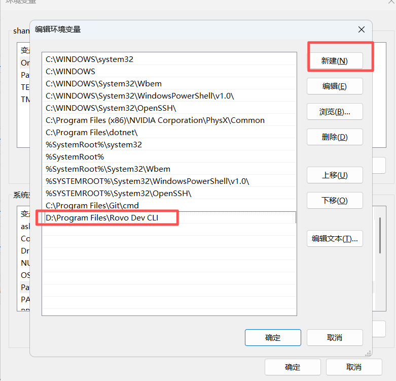 然后再环境变量的path里面加入你的文件夹路径,例如路径:D:\Program Files\Rovo Dev CLI