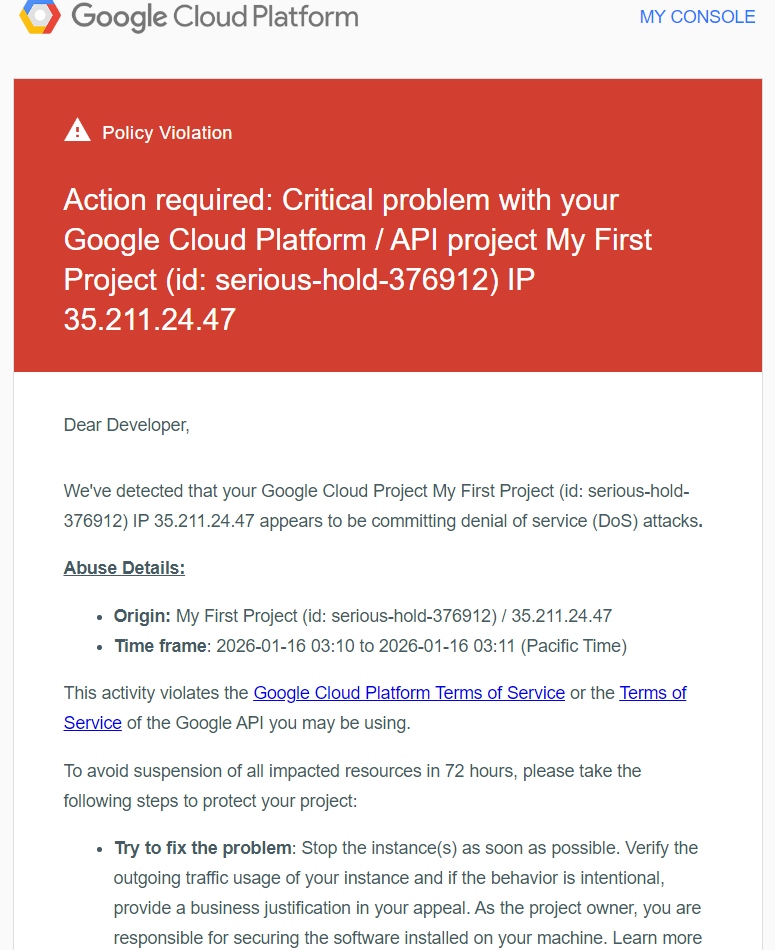 ❌ 高 CPU + 大量异常外联 → 触发 Google DoS 警告