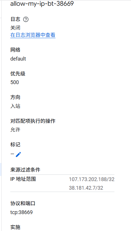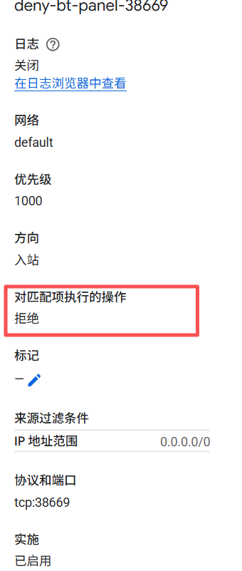 输出具体的BT面板的端口,然后针对该端口去谷歌后台去做策略,具体策略: 里面的IP范围需要换成你自己的访问IP和最低端口,注意不要用我的端口
